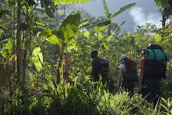 Wir beschlossen, in einer 4-Tages-Wanderung den über 4.000 Meter hohen Vulkan zu besteigen. Im Nationalparkbüro wurden uns drei bewaffnete Führer zugewiesen und ein Träger organisiert. Am nächsten Tag konnte sich dann unsere Karawane in Bewegung setzten und da wir im Büro angegeben hatten, dass wir fit und erfahren sind, bestand der erste Tag gleich aus zwei „normalen“ Aufstiegsetappen. Zu Beginn führte der Weg durch eine Kulturlandschaft. Die Bauern waren emsig damit beschäftigt, ihre Felder für die bevorstehende Regenzeit vorzubereiten. Als nächstes betraten wir schließlich den Nationalpark. Dieser darf landwirtschaftlich nicht genutzt werden und so fanden wir uns in einem tropischen Regenwald wieder. In ca. 3.000 Meter Höhe verließen wir diesen und betraten die Hochgebirgssteppenlandschaft. |